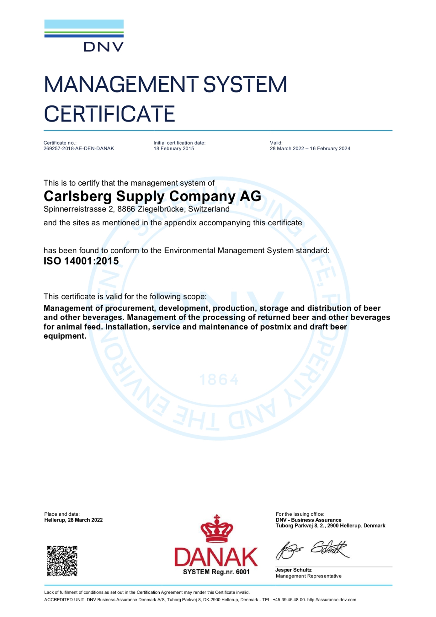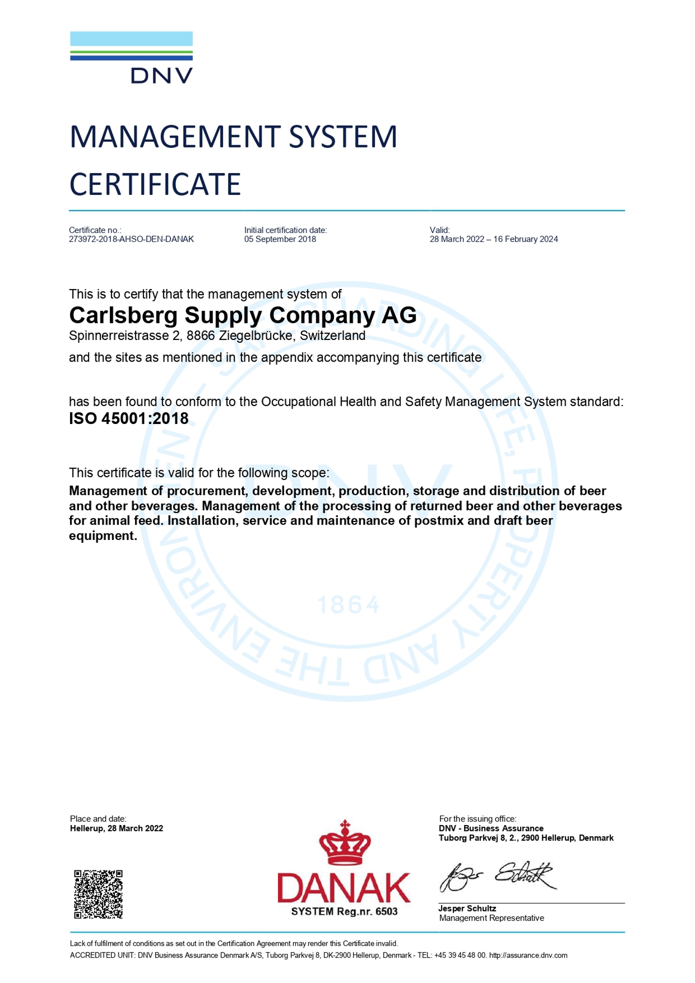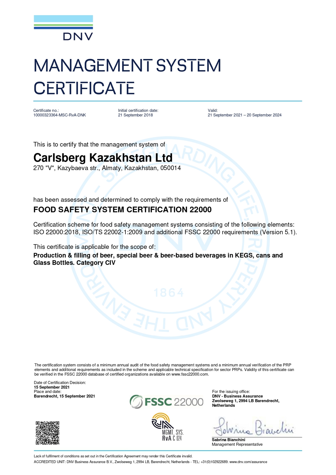 Carlsberg Kazakhstan-ның басымдығы - бұл халықаралық менеджмент стандарттарына сәйкес жоғары сапа және өнімнің қауіпсіздігі. Carlsberg Kazakhstan-да біріктірілген менеджмент жүйесі табысты енгізілген және қолдау табуда. Компания төрт халықаралық стандарт талаптарына.